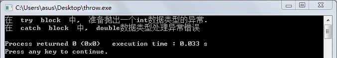 很明显 这个程序在执行了第一个throw之后,首先会在当前block中会检测double型catch 如果检测不到 那么会跳出当前块 然后寻找下一个catch 如果最终找不到 那么程序就会直接退出