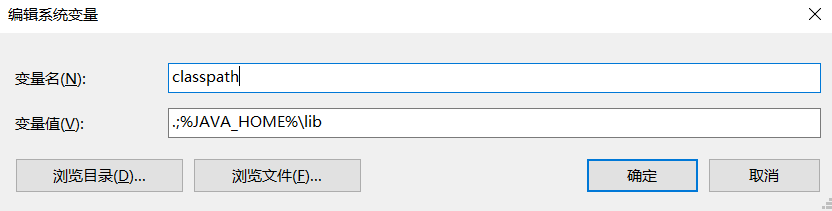 第二对: 变量名:CLASSPATH 变量值:.;%JAVA_HOME%\lib