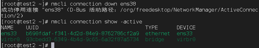 nmcli connection modify ens33 ipv4.addresses 192.168.220.190/24 #修改IP地址 nmcli connection modify ens33 ipv4.gateway 192.168.220.2 #修改网关 nmcli connection modify ens33 ipv4.dns 202.103.24.68 #修改DNS nmcli connection modify ens33 method none #设置为静态IP nmcli connection modify ens33 connection.autoconnect yes #设置网卡为开机自启动 nmcli connection up ens33 #激活网卡