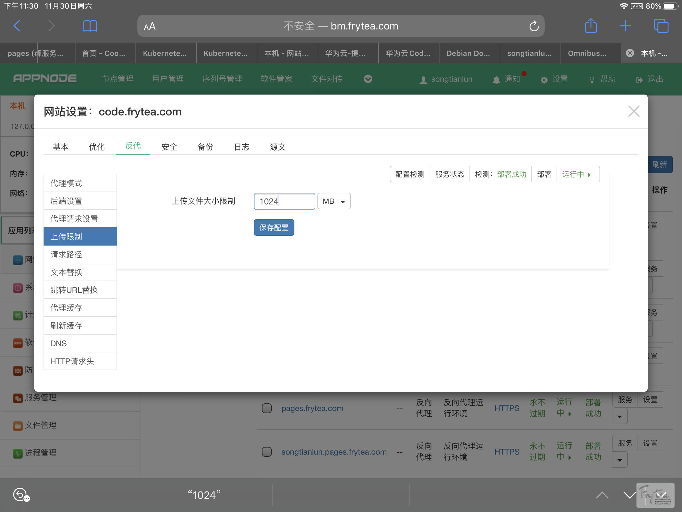我的 GitLab 服务器配置在一台裸金属服务器内部的虚拟机上,没有为它分配外网 IP ,为了使用域名解析,我在宿主机上使用反向代理将域名请求反向代理到内网 IP 上,从而实现了外网访问 GitLab ,但问题就出在这个反代的服务器上了,我思前想后找遍了 GitLab 的配置文件就是没有往它身上想。终于今天我打算使用境外服务器 Runner 配置一下,拉取代码的时候我突然意识到这个问题。