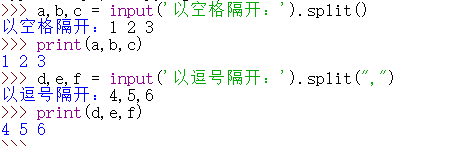 1):利用split()函数进行输入,同时,我们不仅可以利用split()函数一次性输入多个数,我们还可以设置分隔符,除了传统的空格形式,也可以用逗号“,”这种更符合语言习惯的方式分隔输入字符。其原理是因为input()输入了一个字符串,而split()函数能根据设定的分割点分割字符串并返回分割后的字符串列表,所以能实现一次性输入多个数据值。范例如下: