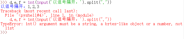 可以看到,这样是不可以的,那么为什么上面单输入可以而多输入报错呢?原因我们其实已经说过了,split()函数返回的是一个列表,spring当然能被转换成int型,但是列表是没法被这样直接转换的,所以我们需要用另一个函数map()来实现多输入的强制类型转换。