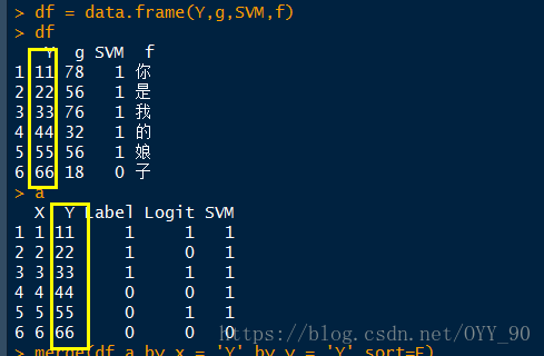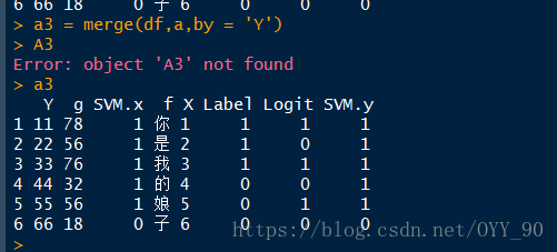 也可以直接写为 by = ‘公共列名’ ,前提是两个数据集中都有该列名,并且大小写完全一致,R语言区分大小写 - by.x,by.y:指定依据哪些行合并数据框,默认值为相同列名的列