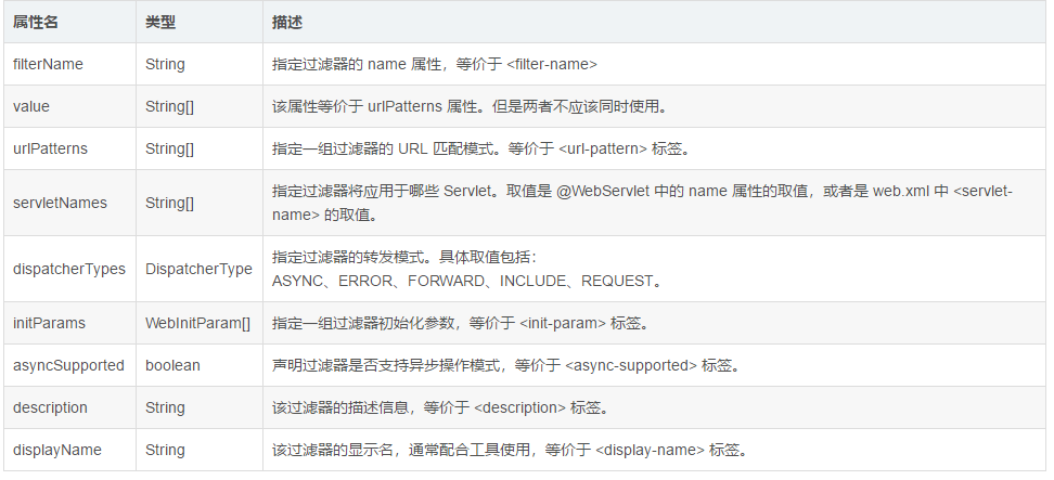 @WebFilter 用于将一个类声明为过滤器,该注解将会在部署时被容器处理,容器将根据具体的属性配置将相应的类部署为过滤器。@WebFilter常用属性: