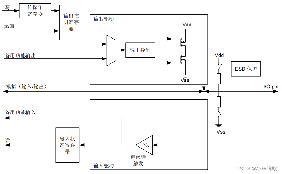 模拟输入:信号进入后不经过上拉电阻或者下拉电阻,关闭施密特触发器,经由另一线路把电压信号传送到片上外设模块。模拟输入是指传统方式的输入,数字输入是输入PCM数字信号,即0、1的二进制数字信号,通过数模转换,转换成模拟信号,经前级放大进入功率放大器,功率放大器还是模拟的。比如传送给ADC模块,由ADC采集电压信号。所以可以理解为模拟输入的信号是未经处理的信号,是原汁原味的信号。