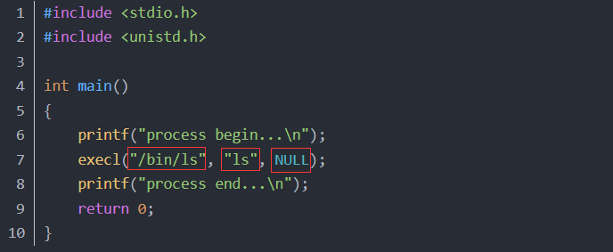 - 具体说明:表示命令所需的参数以char *arg[]形式给出且arg最后一个元素必须是NULL