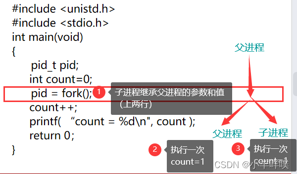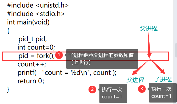 子进程的数据空间、堆栈空间都会从父进程得到一个拷贝,而不是共享。在子进程中对count进行加1的操作,并没有影响到父进程中的count值,父进程中的count值仍然为0