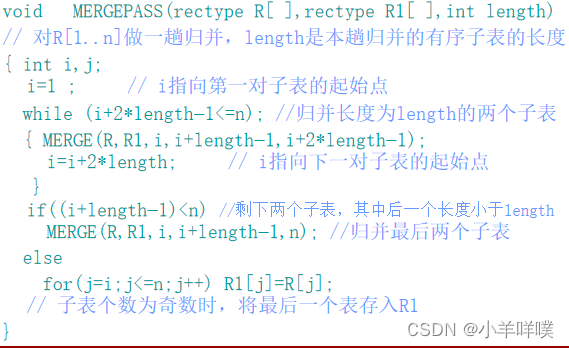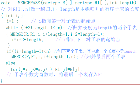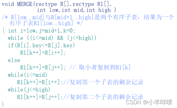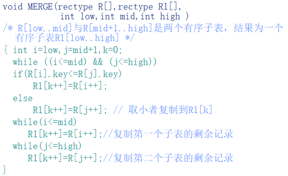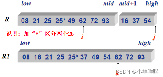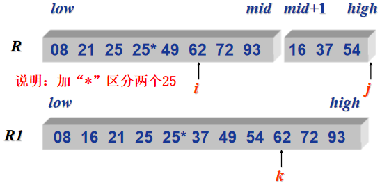 - 设两个有序子表(相当于输入堆)放在同一向量中相邻的位置上:R[low..mid],R[mid+1..high],先将它们合并到一个局部的暂存变量R1(相当于输出堆)中,待合并完成后将R1复制回R[low..high]中。
