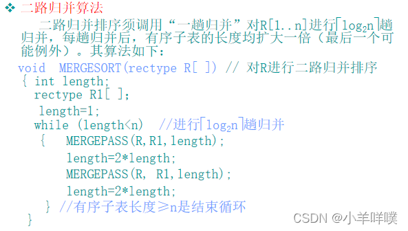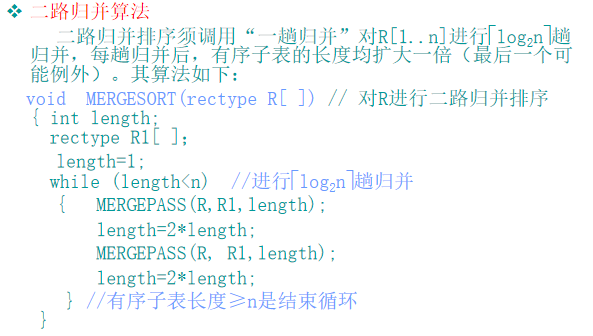 假设初始表含有n个记录,则可看成是n个有序的子表,每个子表的长度为1,然后两两归并,得到-【n/2】个长度为2或1的有序子表,再两两归并,……,如此重复,直至得到一个长度为n的有序子表为止。
