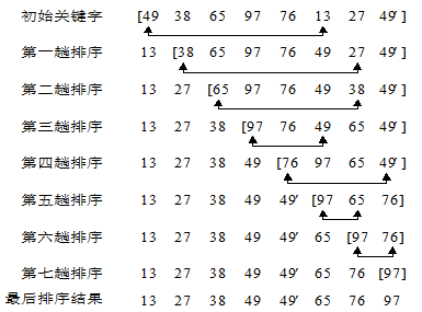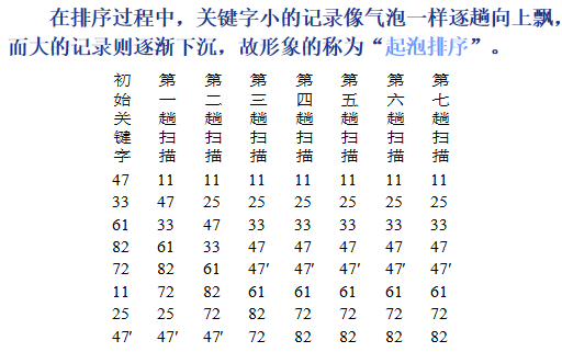 - 两两比较待排序记录的关键字,发现两个记录逆序时即进行交换,直至没有逆序的记录为止。