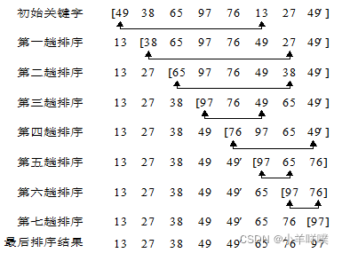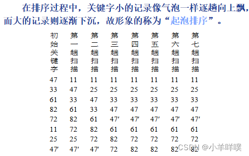 - 将关键字按纵向排列,然后自下而上地对每两个相邻的关键字进行比较,若为逆序( 即 k j-1>kj),则将两个记录交换位置。这样的操作反复进行,直至全部记录都比较、交换完为止。如此一趟排序后,就将关键字最小的记录安排在第一个记录的位置上。