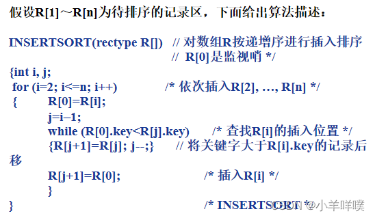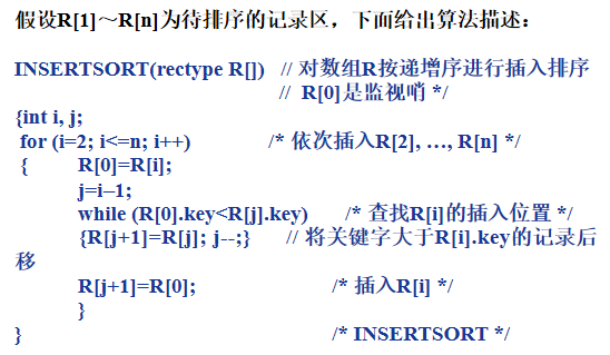 ①进入查找循环之前,它保存了R[i]的副本,使得不致于因记录的后移而丢失R[i]中的内容; ②在while循环中“监视”下标变量j是否越界,以避免循环内每次都要检测j是否越界。因此,我们将R[0]称为“监视哨”,这使得测试循环条件的时间大约减少一半。