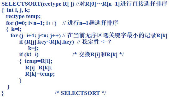- 因为每趟排序都使有序区中增加了一个记录,且有序区中的记录关键字均不大于无序区中记录的关键字,所以,进行n-1趟排序后,整个文件就是递增有序的。