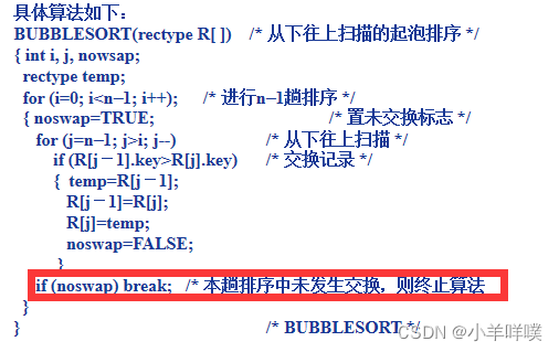 - 引入一个布尔量noswap,在每趟排序之前,先将它置为TRUE。在一趟排序结束时,我们再检查noswap,若未曾交换过记录便终止算法。