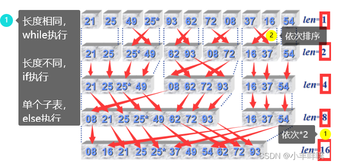 - 再做两两归并,…,如此重复,最后得到一个长度为 n 的有序序列。
