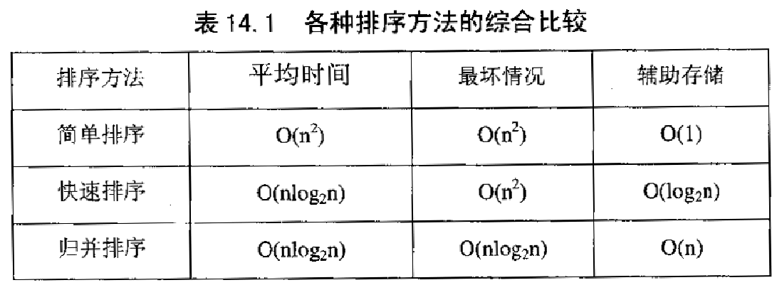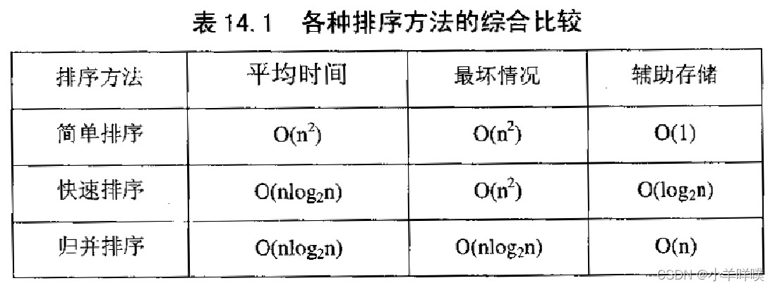 表中的“简单排序”包括除希尔排序之外的所有插入排序、起泡排序和直接选择排序,其中直接插入排序最为简单。