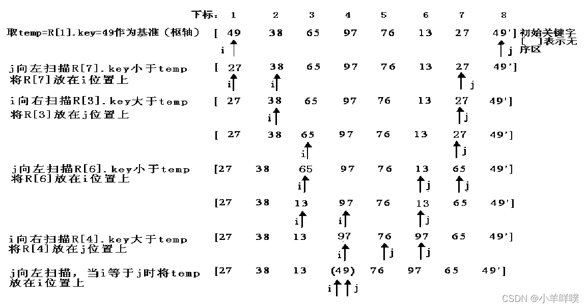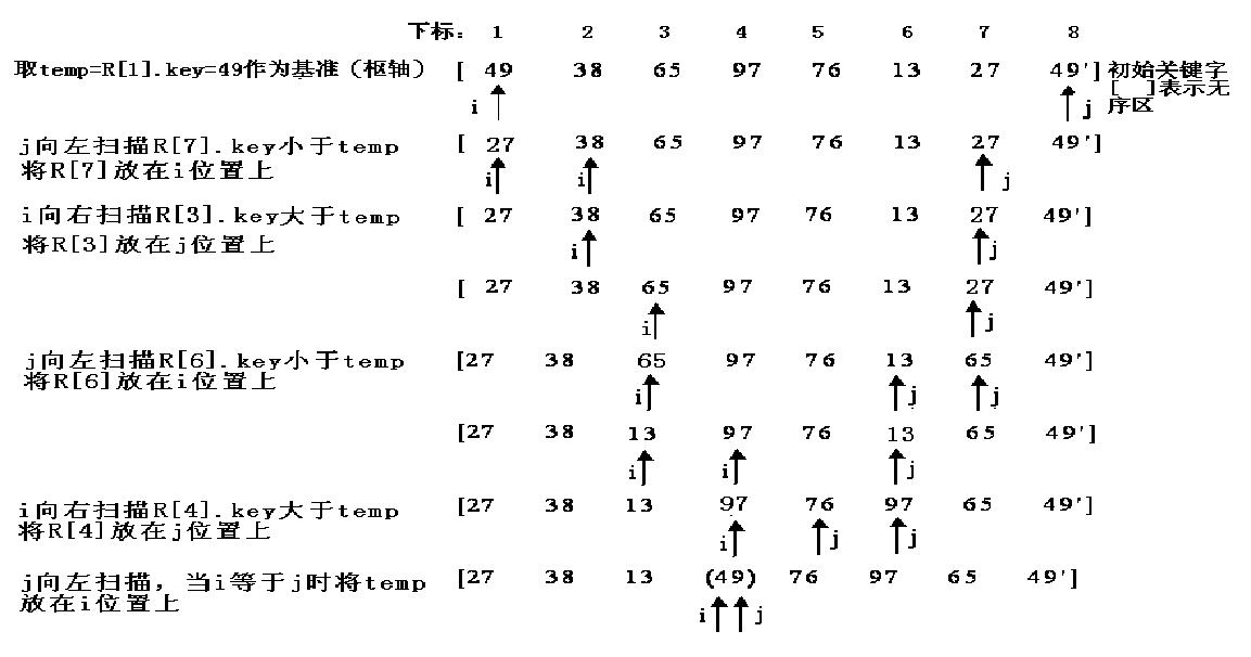 - 然后分别对这两个子序列重复施行上述方法,直到所有的记录都按关键字有序排在相应位置上为止。