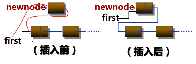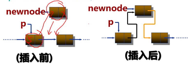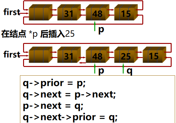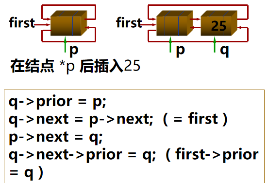 q->next = p->next; p->next = q; //在后继方向链入新结点