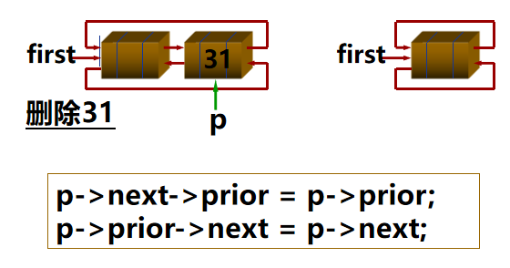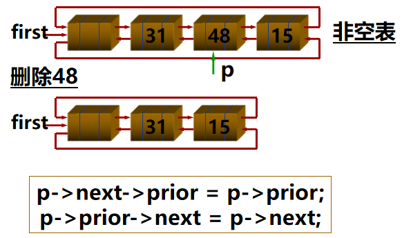 p->prior->next = p->next; //将被删结点 *p 从链上摘下
