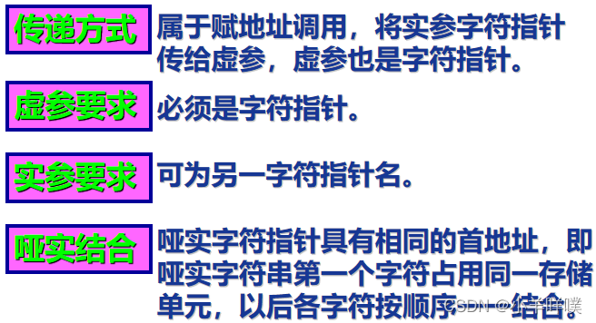 ⑥字符数组可用于存放字符串,直接通过数组元素存取字符串属于直接寻址,字符指针则属于间接寻址。