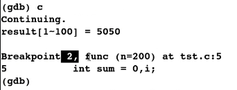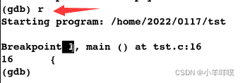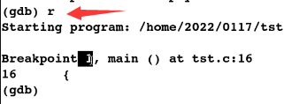 (gdb)r——运行到第一个断电→敲回车,重复之前的内容(继续运行)