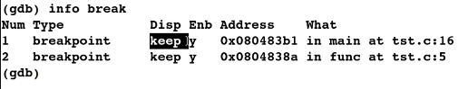 | break(b)行号 if条件 当条件为真,指定行处断电生效 | |