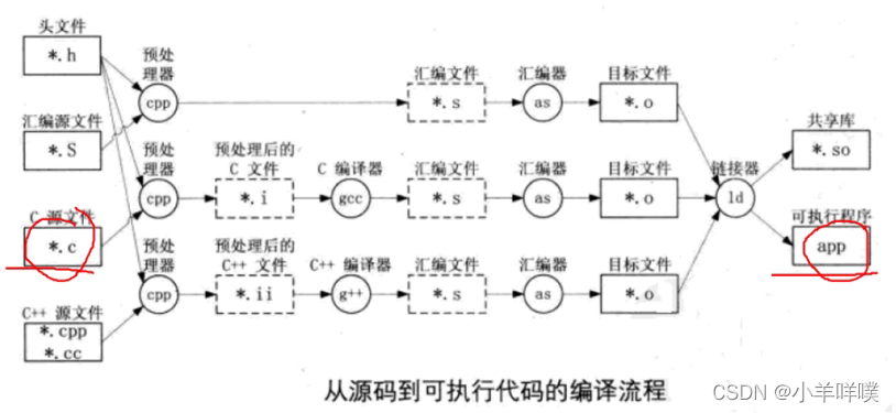 C源程序头文件------>①预编译处理(cpp)------>②编译程序本身------>③优化程序------>④汇编程序------>⑤链接程序------>⑥可执行文件