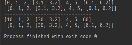 1 name = [0,1,2,[3.1,3.2],4,5,[6.1,6.2]] 2 name2 = name.copy() #将name中储存的数据复制一份给name2 3 print(name,'\n',name2) 4 print('-------------------------------') 5 name[0] = 10 6 name[6] = 60 7 name[3][0] = 30 8 print(name,'\n',name2)