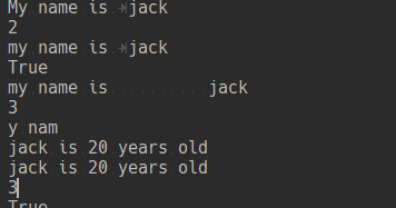 name = 'my name is \tjack' print(name.capitalize()) #首字母大写 print(name.count('a')) #统计字符串中a的数量 print(name.center(10,'+')) #打印10个字符将name的值放在中间,不够用+补齐 print(name.endswith('ck')) #判断字符串是不是由ck结尾 print(name.expandtabs(20)) #将一个\t转化为20个空格 print(name.find('name')) #返回name所在的位置 找不到返回-1 print(name[1:6]) #切片输出,输出1-6的元素 information = '{name1} is {age1} years old' print(information.format(name1 = 'jack',age1 = 20)) print(information.format_map({'name1':'jack','age1':'20'})) #使用字典 print(name.index('name')) #返回name所在的位置 找不到抛出异常