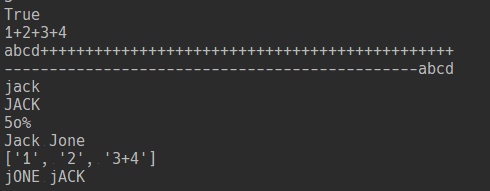 print('aa'.isalpha()) #判断是不是纯英文字符 print('+'.join(['1','2','3','4'])) #将列表变为字符串,以+为间隔符 print('abcd'.ljust(50,'+')) #50个长度不够右侧用+作为占位符 print('abcd'.rjust(50,'-')) #50个长度不够左侧用-作为占位符 print('Jack'.lower()) #返回小写 print('Jack'.upper()) #返回大写 p=str.maketrans('abcdefg','1@/*+5%') #两个字符串一一对应,指定字符转化规则 print('fog'.translate(p)) #‘fog’按照p这个规则进行加密 print('jack jone'.replace('j','J',2)) #将字符串中的j改为J转换两个(缺省为全部替换) print('1+2+3+4'.split('+',2)) #将+号作为分隔符返回列表值,执行2次(缺省为全部) print('Jone Jack'.swapcase()) #大小写反转 print('jone jack'.title()) #转换为标题样式