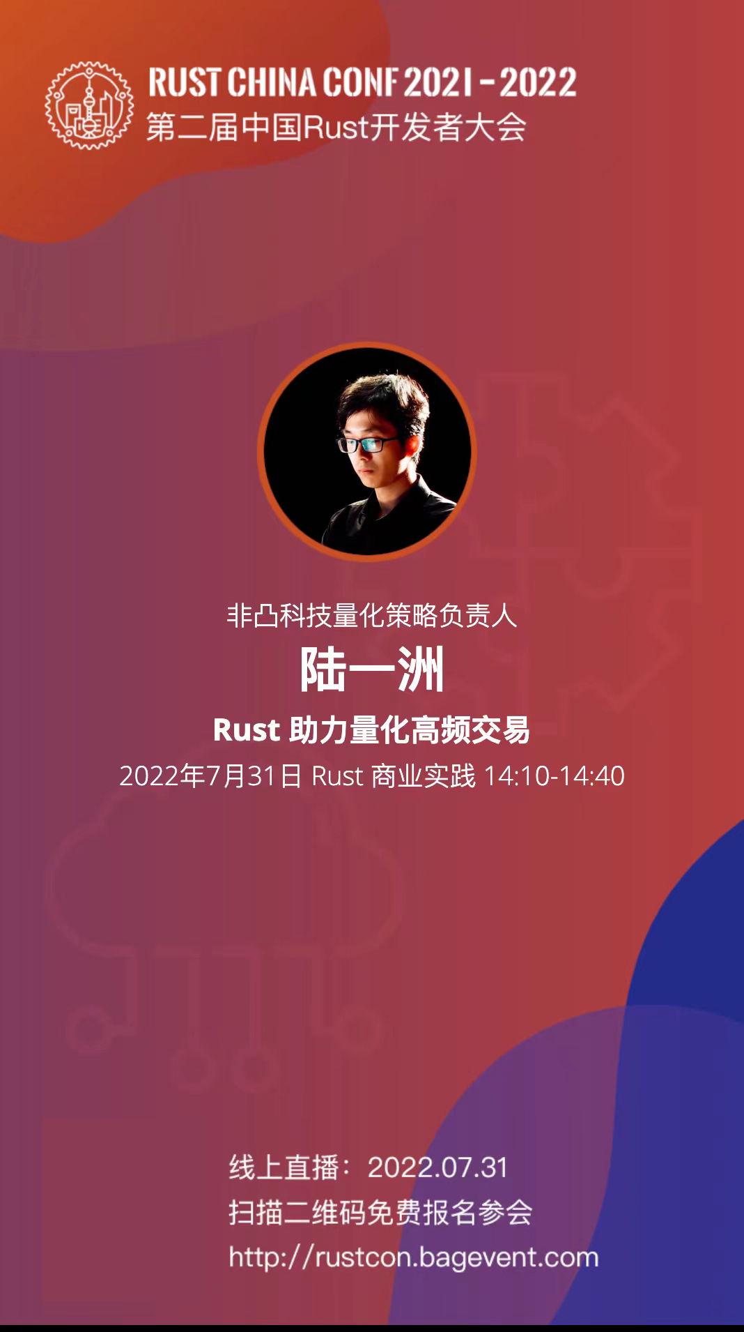 关于Rust与量化的场景应用关系,在7月31日下午给你带来实践分享!上海交大学长分享主题:「Rust 如何助力量化高频交易」,敬请期待!