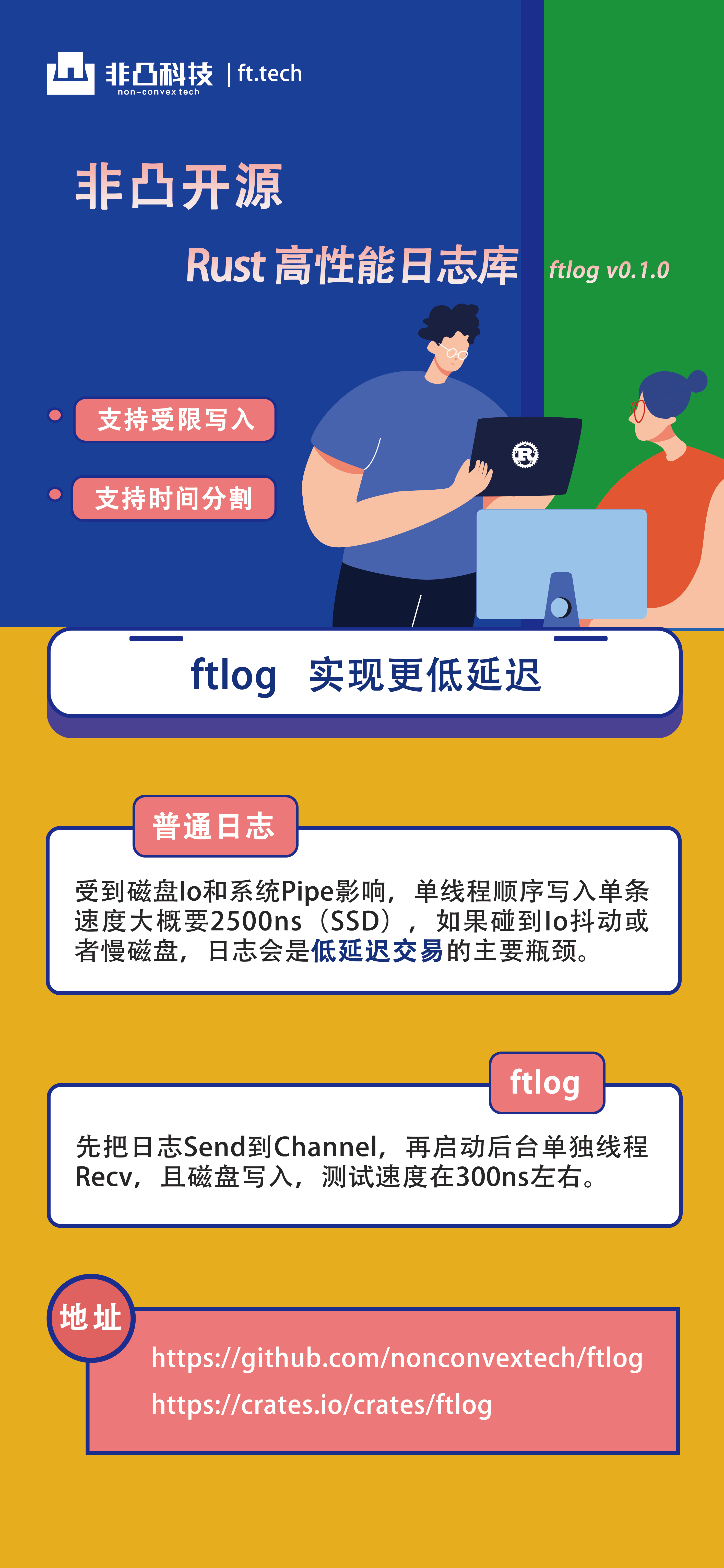 普通日志库受到磁盘IO和系统Pipe的影响,单线程顺序写入单条速度大概要2500ns(SSD),如果碰到IO抖动或者慢磁盘,日志会是低延迟交易的主要瓶颈。而非凸科技开源的Rust高性能日志库ftlog v0.1.0,先把日志Send到Channel,再启动后台单独线程Recv,且磁盘写入,测试速度在300ns左右。
