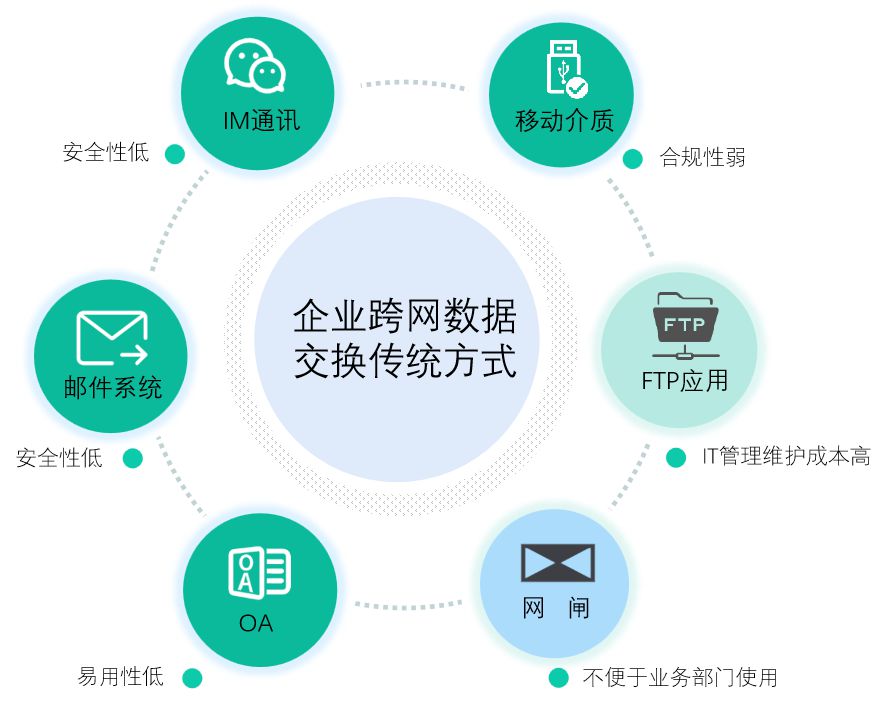 传统的跨网数据摆渡方式,例如使用移动硬盘、FTP、邮件等,存在着诸多痛点: