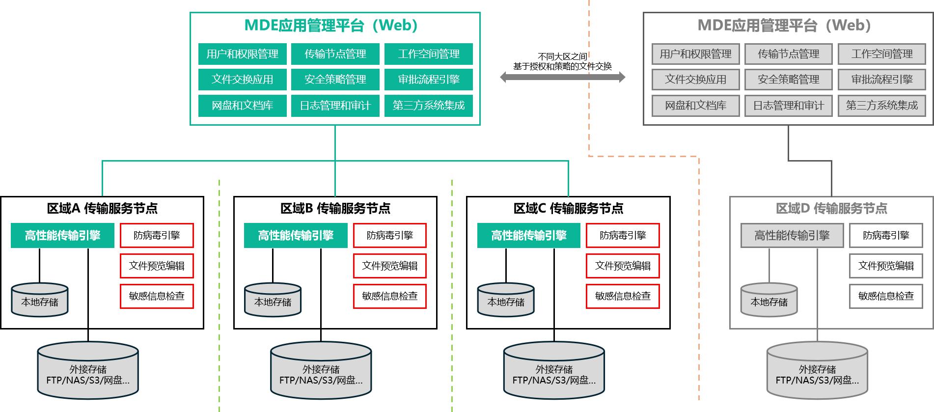 基于上述问题,Ftrans飞驰云联推出《Ftrans MDE多区域文件交换系统》,支持“一套Ftrans文件交换管理平台+多个引擎”的部署模式,让企业基于一套Ftrans文件交换管理平台,即可实现对多个网络传输节点的统一运维管理,有效解决了传统跨网文件交换中多系统独立部署带来的管理碎片化、运维效率低、安全风险高等问题。
