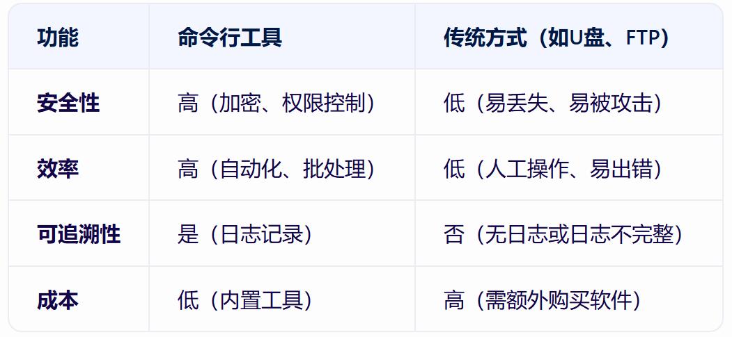 通过以下的表格内容分析可以看出,命令行工具相较于传统的传输方式是具有很多优势的。