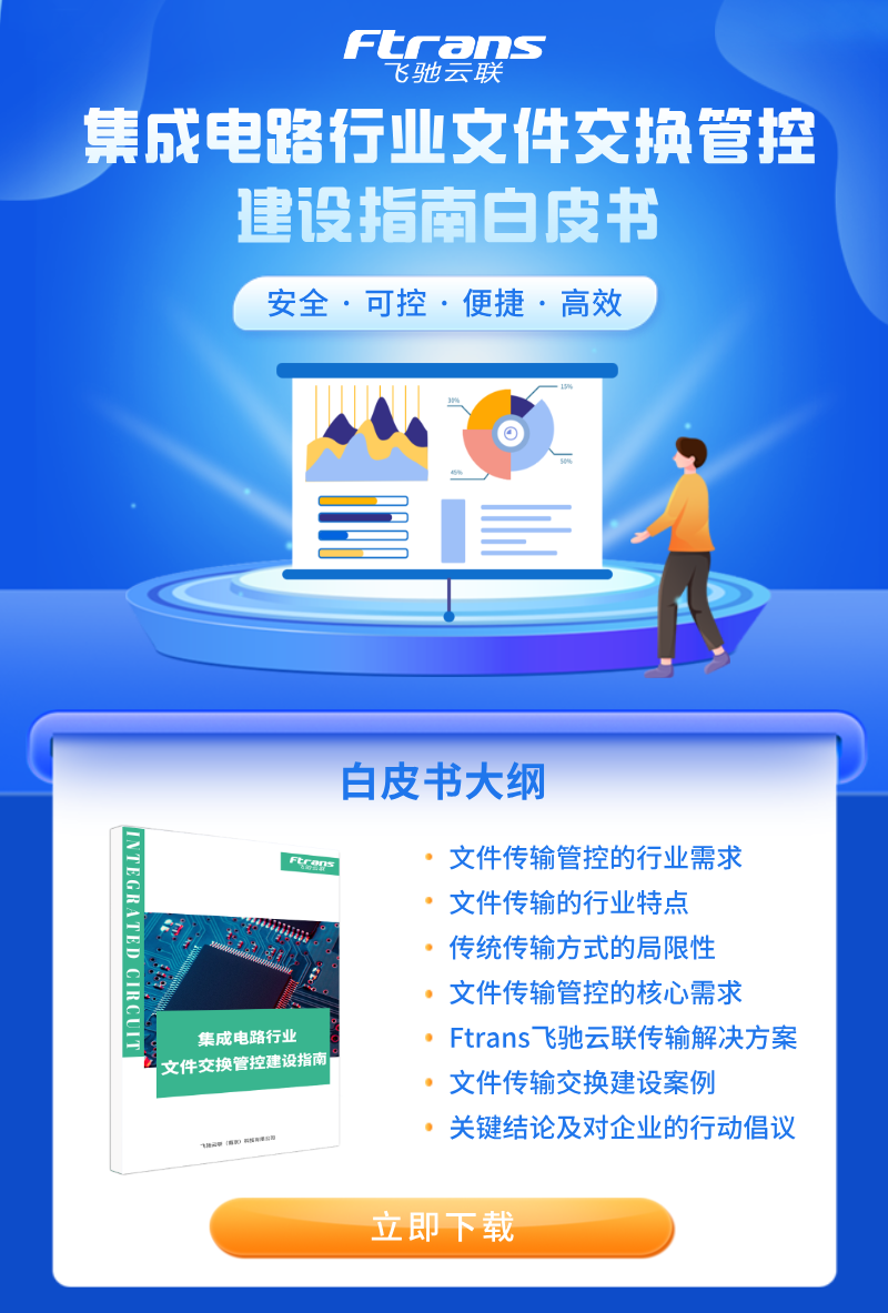 Ftrans飞驰云联基于对集成电路行业的深度洞察,正式发布《集成电路行业文件交换管控建设指南》白皮书。该白皮书系统性地解构了行业痛点,提出覆盖安全传输、权限治理、审计追溯、传输加速的一体化解决方案,并辅以头部Fabless厂商、晶圆制造、IC设计、IDM企业等实证案例,为行业提供可落地的建设方法论。