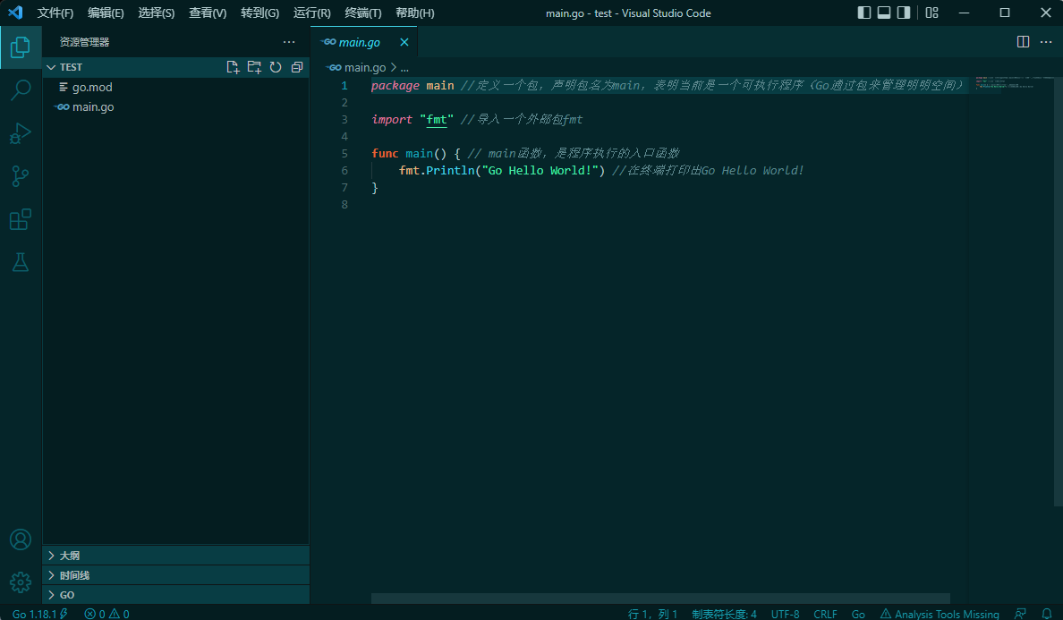 go.mod是代码依赖库管理工具,代码中import引入的库文件都通过此文件管理。现在开始写第一行go程序
