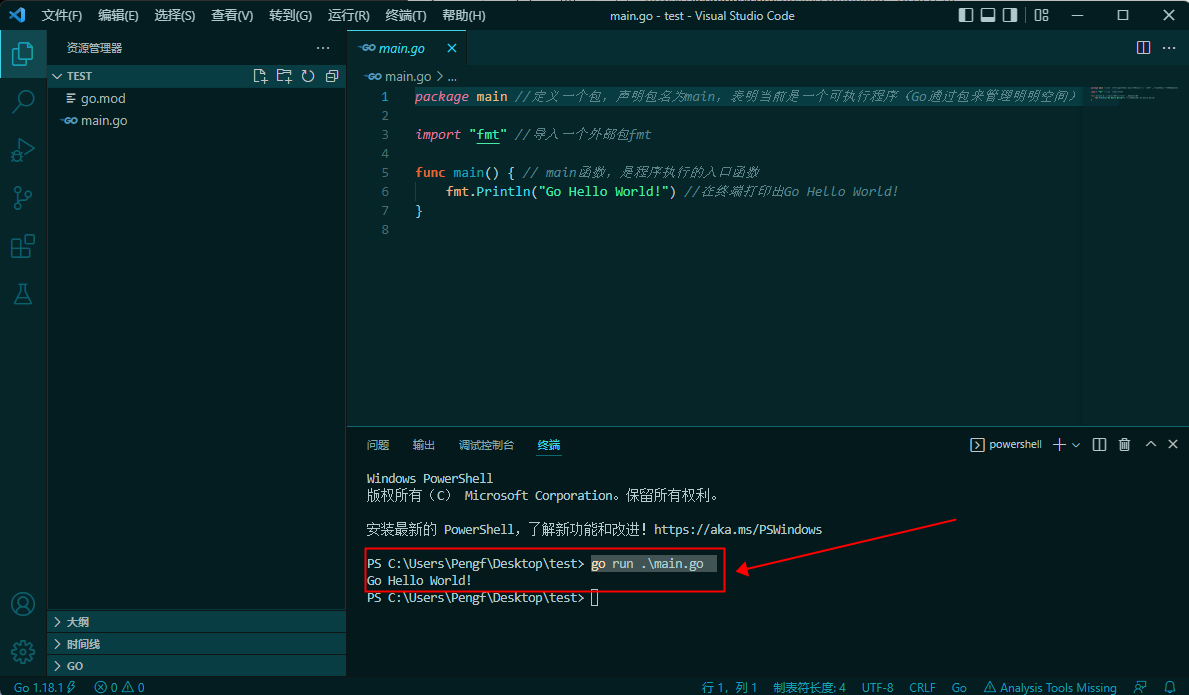 新建终端,输入【go run .\main.go】,可以看到hello world语句输出。至此Go语言基本的开发环境已经搭建完成。