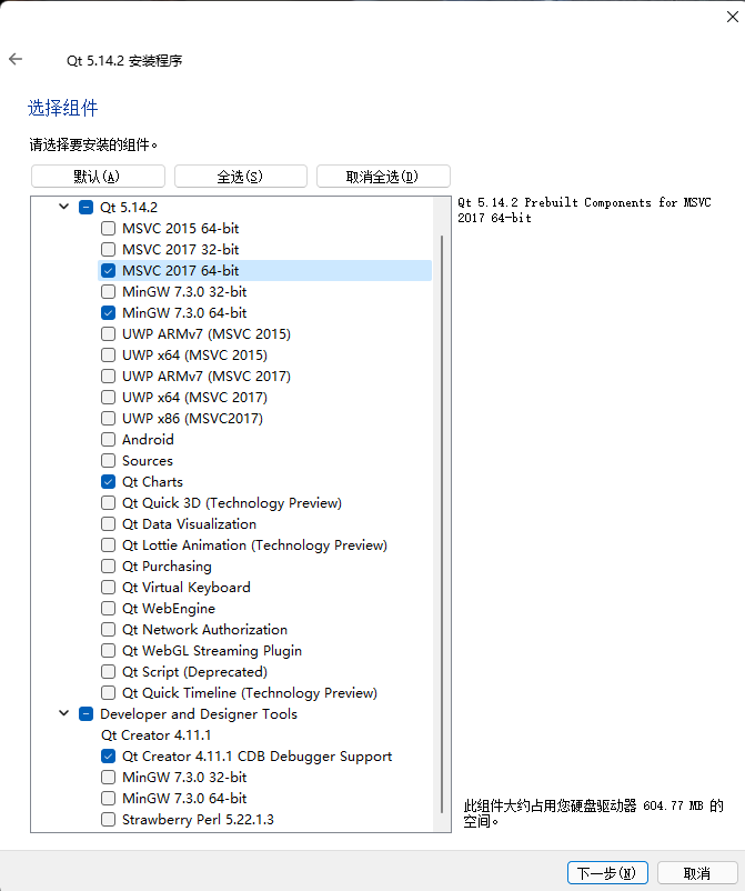 2、一路点击下一步,安装程序选择以下几个。其中MSVC和MinGW分别为配合微软VS插件的编译器和QT自带的编译器,必选一个。
