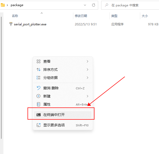 在此文件夹下shift+右键,选择在终端打开