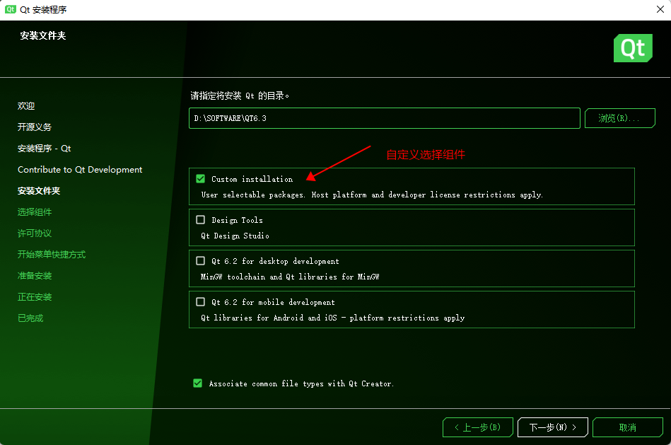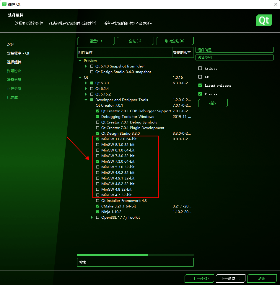 这里默认是QT6.3,我们取消勾选,选择QT5.15.2。