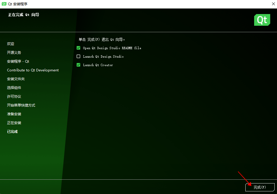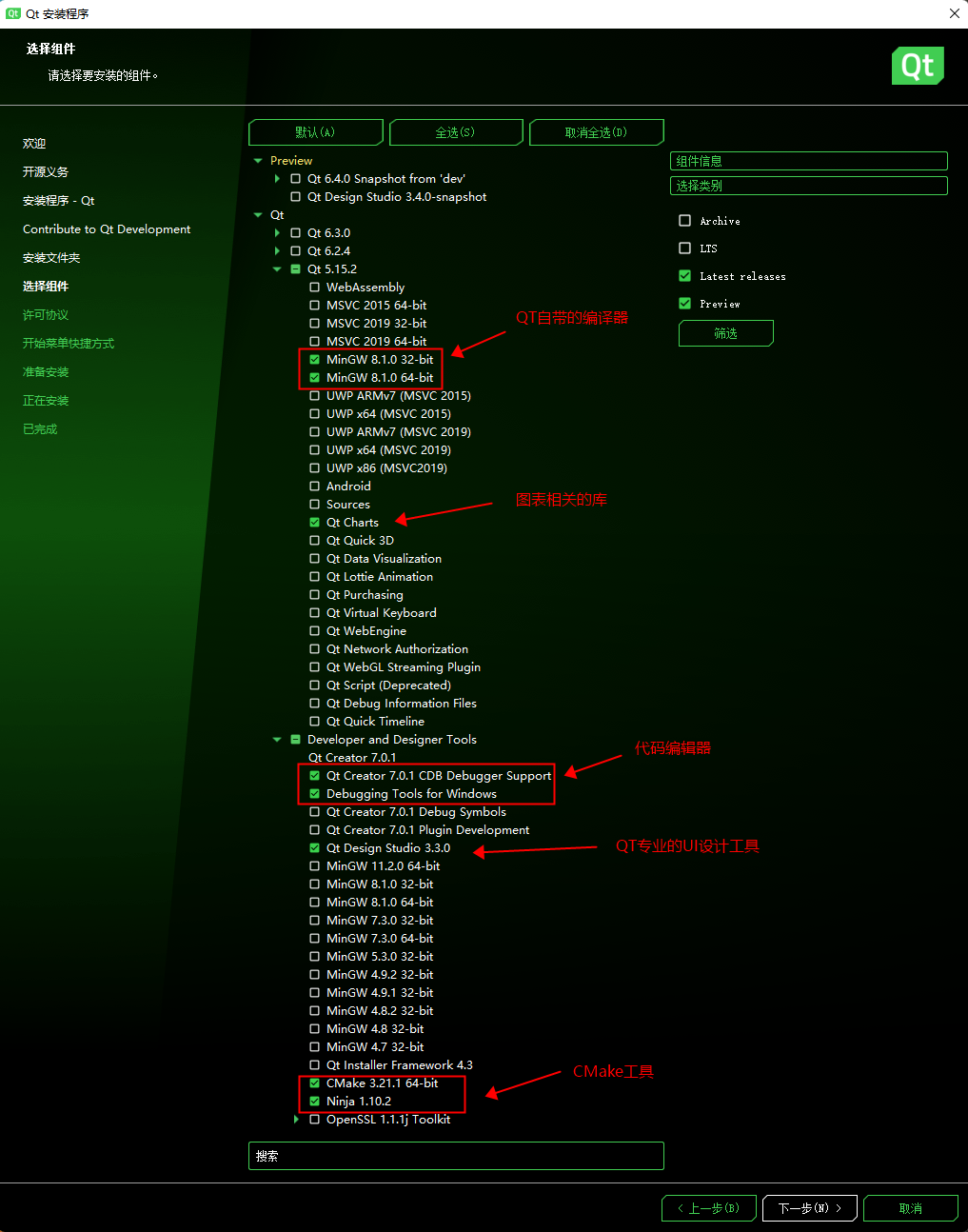 Qt Charts为QT自带的二维图表库,如果用不到可以不选择。QT Creator为QT官方IDE,必选。其余自行了解。