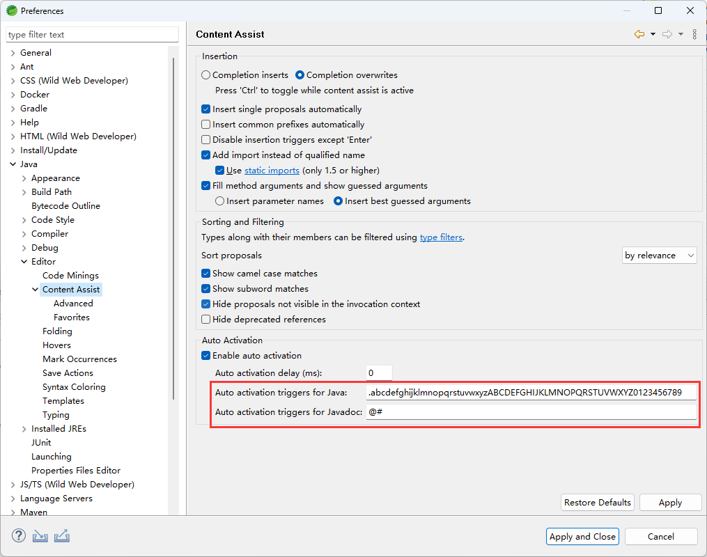 修改Auto activation triggers for Java