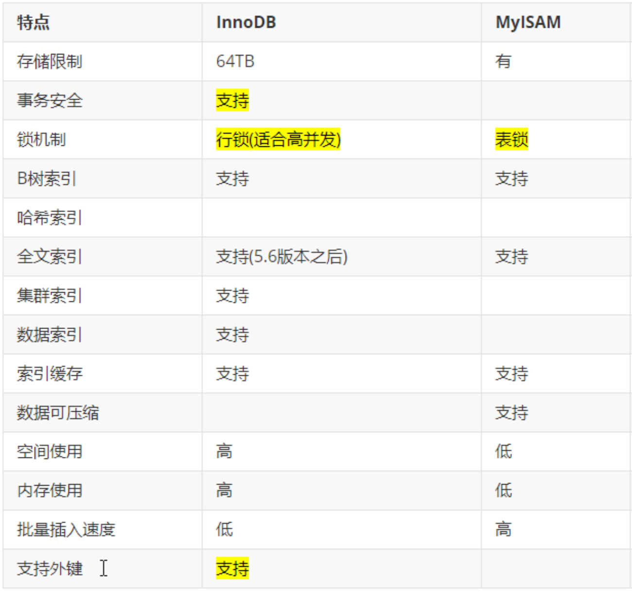 MyISAM: 不支持事务不支持外键访问速度快对数据完整性要求不高可使用