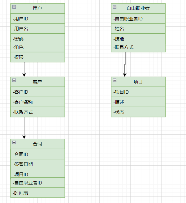 领域模型:定义自由职业者、客户、项目和合同等核心实体及其关系。