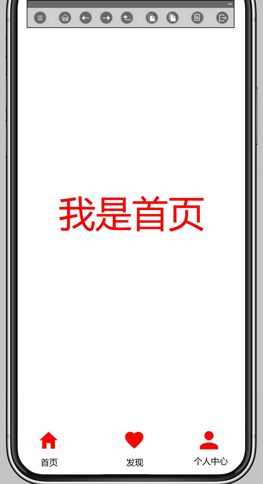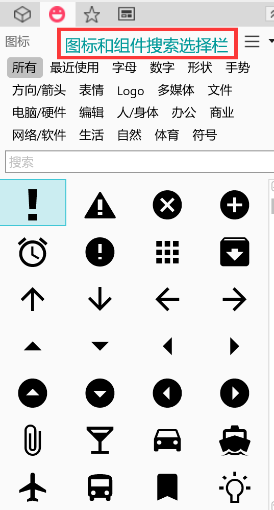 - 导航栏制作:如图所示,在界面左侧图标选项卡中搜索想要的图标,配合单行文字组件,拖拽到中间页面,即可完成底部导航栏制作。将图标与对应单行文字选中,右键合并为组,大小、样式、文字等均可在页面中或界面右侧编辑设置。如图是做好的底部导航栏。