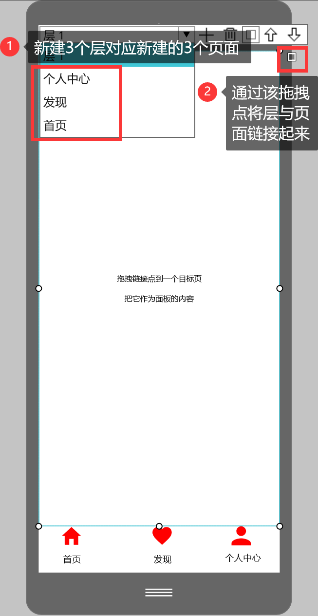 a. 拖出内容面板,点击“+”创建3个层,每层分别拖拽链接点连接到三个内容页面。