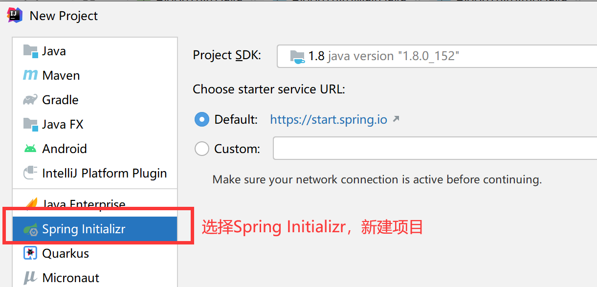 1. 如图所示,依次点击 File -> New -> Project ,选择 SpringBoot Initializr,新建一个 SpringBoot 项目,然后点 Next 。注意,新建过程中必须保持电脑联网,因为创建项目时需要连接到外部地址 https://start.spring.io 。