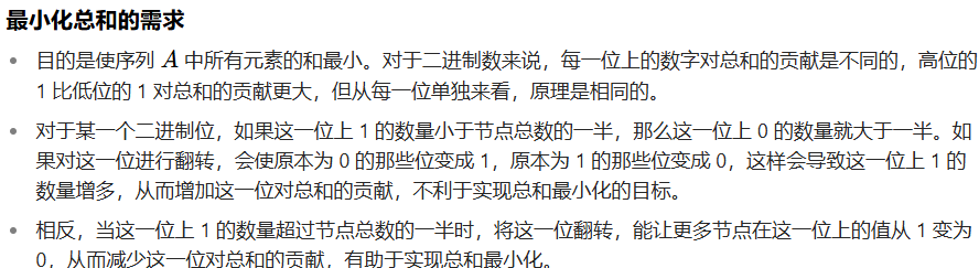 - 如果超过一半的节点该位为 1,则翻转该位(异或 1<<k),使更多值为 0