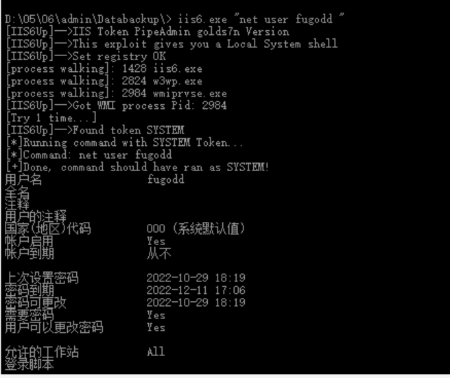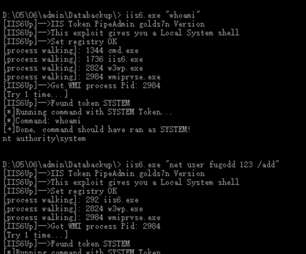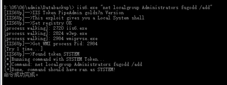 第一段命令里发现已经给予你了system token ,最后返回到了普通用户组。意思我理解为在当前iis6.exe里你有短暂管理员权限。